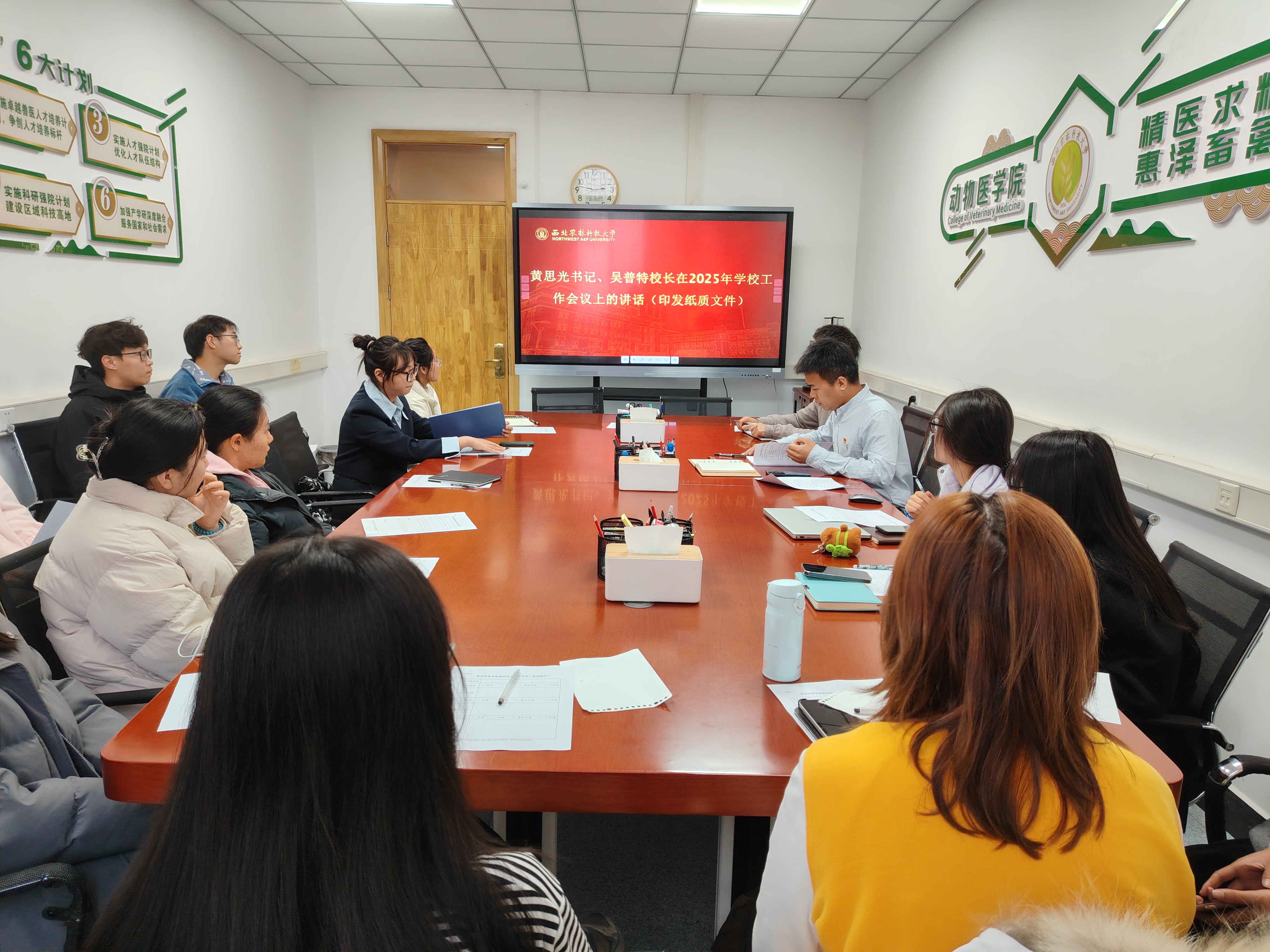 在第一部分学习中,秦冰雨同学为成员们讲解了此次的学习内容,例如坚持以习近平新时代中国特色社会主义思想为指导,全面贯彻落实党的二十大和二十届二中、三中全会精神等,在之后支部成员针对所了解的相关案例进行了相互交流,巩固所学知识,收获颇丰。紧接着由支部书记王志凯老师带领支部成员学习黄思光书记、吴普特校长在2025年学校工作会议上的讲话,明确了学校的发展战略和目标,如“双一流”建设、乡村振兴等,激励大家为学校发展贡献力量,最后进行文件传阅学习,支部成员纷纷提出自己的问题,师生之间进行了积极的交流。
